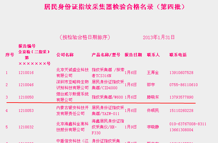 2013年2月19日,國家安全防范報警系統(tǒng)產(chǎn)品質(zhì)量監(jiān)督檢驗中心、公安部安全與警用電子產(chǎn)品質(zhì)量檢測中心和公安部特種警用裝備質(zhì)量監(jiān)督檢驗中心聯(lián)合公布了第四批居民身份證指紋采集器檢驗合格企業(yè)名錄,煙臺威爾數(shù)據(jù)系統(tǒng)有限公司的指紋采集器憑借優(yōu)良的品質(zhì)和最新的科技率先通過了檢測,為進(jìn)一步推進(jìn)和拓展二代指紋項目奠定了堅實基礎(chǔ)。