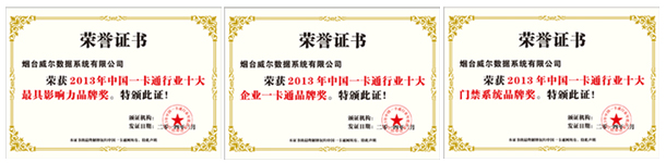 煙臺威爾公司榮獲由中國一卡通網(wǎng)主辦、浙江正元智慧科技股份有限公司贊助的“2013(第四屆)中國一卡通行業(yè)年度評選”中的三項(xiàng)大獎(jiǎng),分別是:"2013中國一卡通行業(yè)十大最具影響力品牌"、"2013中國一卡通行業(yè)十大企業(yè)一卡通品牌"、"2013中國一卡通行業(yè)十大門禁系統(tǒng)品牌"。