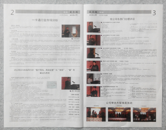 本報刊對各部門負(fù)責(zé)人及優(yōu)秀員工代表在年會上發(fā)言的重點(diǎn)內(nèi)容進(jìn)行了總結(jié)性報道。同時,報刊還涵蓋了大量的年會現(xiàn)場照片,將優(yōu)秀員工、團(tuán)隊(duì)頒獎以及員工聚餐、節(jié)目表演、抽獎環(huán)節(jié)等,圖文并茂的呈現(xiàn)在讀者面前,希望能將威爾公司2015年年會現(xiàn)場那精彩紛呈、熱烈歡快的氣氛也一并傳遞給讀者。