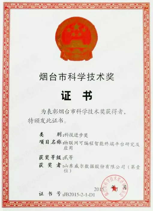 2016年5月23日,煙臺市委、市政府在東山賓館召開“全市堅持創(chuàng)新發(fā)展理念深入實施創(chuàng)新驅(qū)動發(fā)展戰(zhàn)略大會”,煙臺市委書記孟凡利、市領(lǐng)導(dǎo)李淑芹、張永霞等出席會議,會上隆重表彰了我市2015年度市科技獎勵獲獎單位和個人。山東威爾數(shù)據(jù)股份有限公司憑借“物聯(lián)網(wǎng)可編程智能終端平臺研究及應(yīng)用”創(chuàng)新成果在所有參選項目中獲得評分第一名,獲得“科學(xué)技術(shù)獎二等獎(一等獎空缺)。