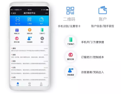 威爾數(shù)據(jù)的手機移動端依托微信服務(wù)號可以做到每個企業(yè)獨有一個客戶端的目標(biāo),這樣的設(shè)計防止了公司機密數(shù)據(jù)外泄,針對用戶的痛點客戶端集成了二維碼掃碼考勤、手機定位考勤、充值消費方便快捷、訪客邀請、訂餐統(tǒng)計控制成本、手機門禁開門、多級審批七大功能于一體進(jìn)一步減輕企業(yè)管理的成本與負(fù)擔(dān)。