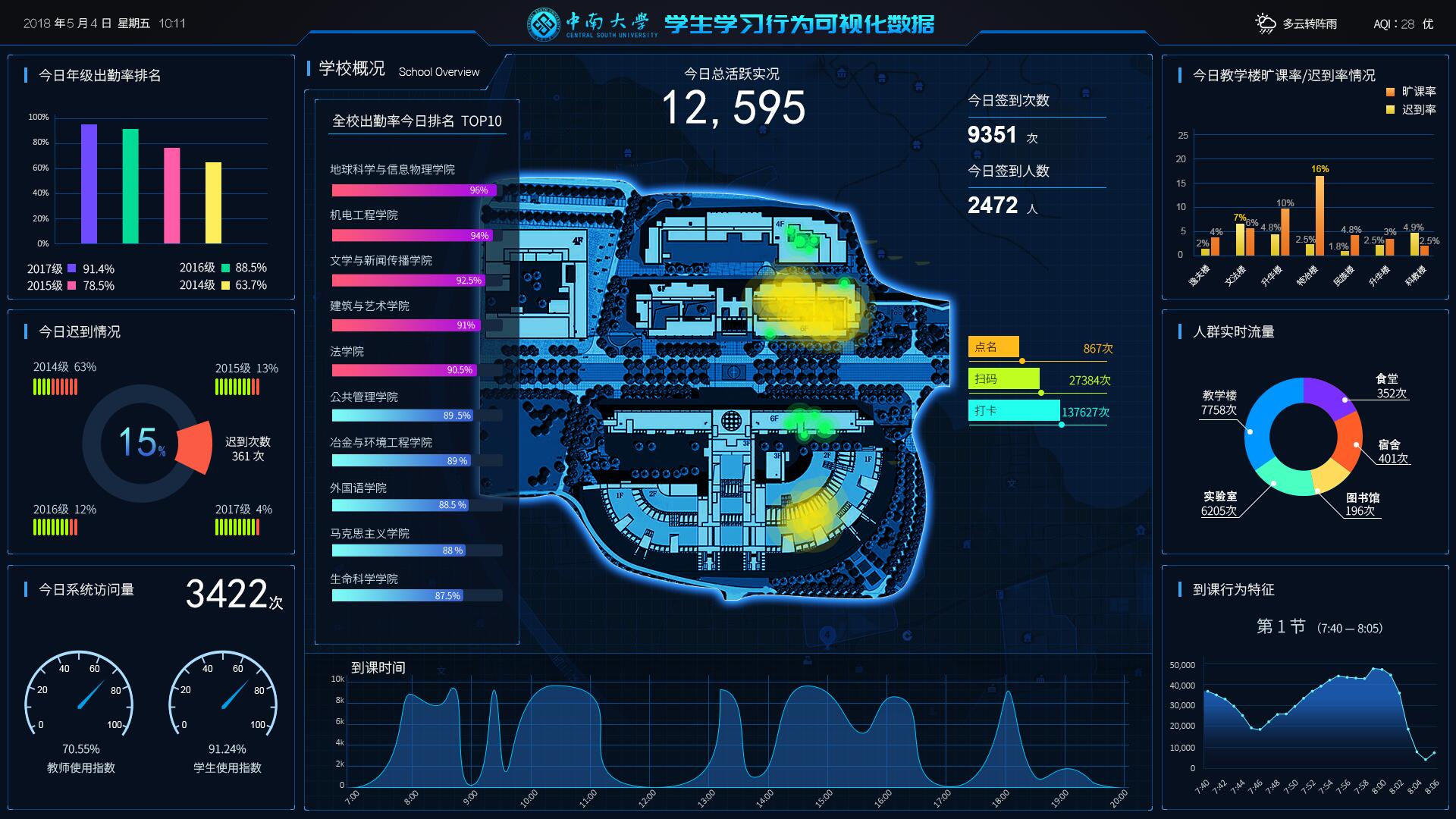 針對(duì)學(xué)生的上課行為進(jìn)行多維度的數(shù)據(jù)分析,通過(guò)WEB端、移動(dòng)端、可視化大屏進(jìn)行展示;清理和整合學(xué)校繁雜的異構(gòu)數(shù)據(jù),形成統(tǒng)一、規(guī)范、準(zhǔn)確的數(shù)據(jù),并建立對(duì)外輸出接口,可向外輸出;