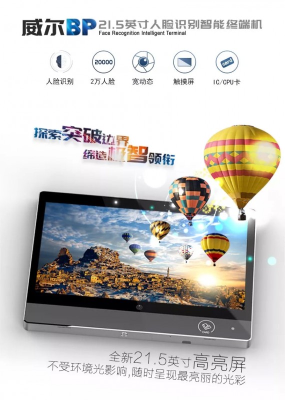 威爾BP21.5英寸人臉識別智能終端,采用高寬動態(tài)(105db),降低設備對環(huán)境光的依賴,強光、逆光、夜間均可快速識別。