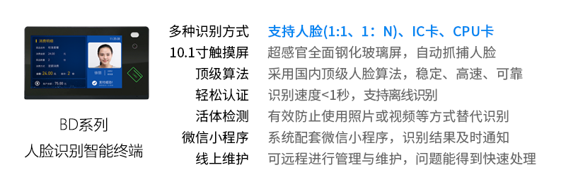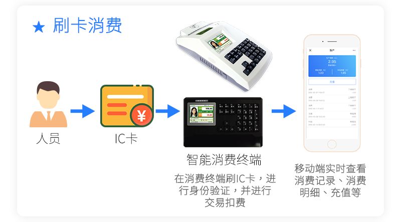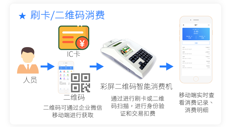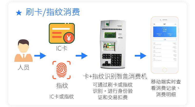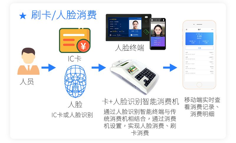 持卡人開通電子錢包賬戶后,即可消費電子錢包余額。系統(tǒng)支持IC卡、NFC手機卡、2.4G手機卡、指紋、二維碼、人臉等多種識別方式
