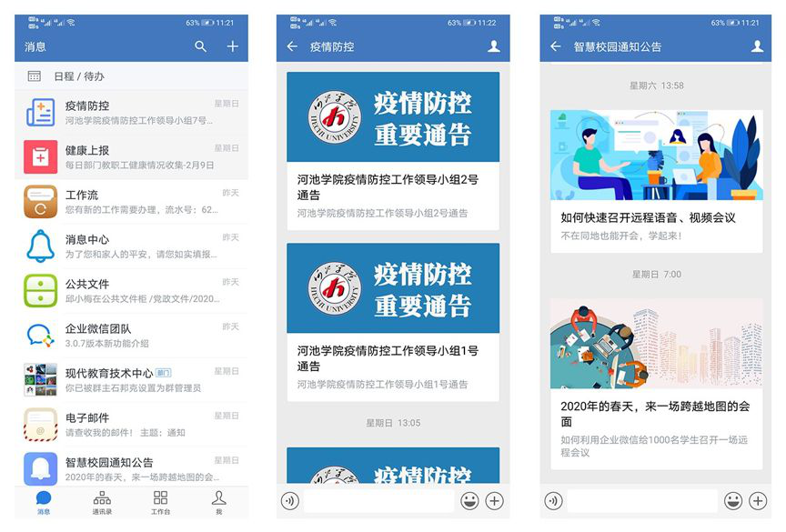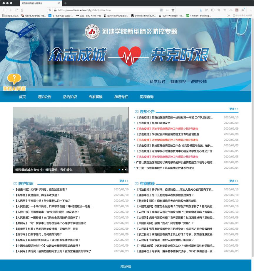 為有效進(jìn)行防疫信息傳達(dá)和宣傳,河池學(xué)院在學(xué)校企業(yè)微信平臺(tái)上建設(shè)了“疫情防控”模塊,向全校師生發(fā)布疫情防控工作領(lǐng)導(dǎo)小組的通知、通告和疫情防控知識(shí),并在智能AI客服加入疫情防控知識(shí),通過AI提供師生關(guān)心的疫情防控信息。校方還完成了“疫情防控專題網(wǎng)站”的部署,提供與防疫相關(guān)的多種欄目服務(wù)。