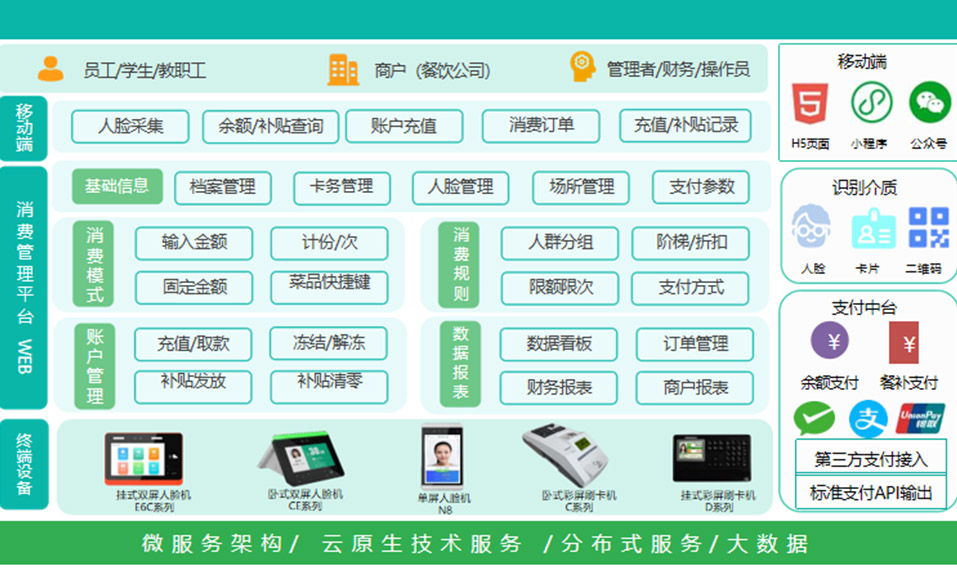 消費(fèi)管理系統(tǒng)主要為家長(zhǎng)繳費(fèi)、學(xué)生消費(fèi)、學(xué)校退費(fèi)、監(jiān)管消費(fèi)異常行為提供技術(shù)支撐。支持線上繳費(fèi)、人臉識(shí)別消費(fèi),確保每筆餐費(fèi)透明可溯。