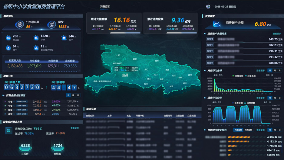 縱觀市場,能夠同時滿足以上苛刻條件的解決方案實屬鳳毛麟角。而威爾數(shù)據(jù)的"中小學校食堂智慧管理系統(tǒng)",已在湖北省建成省級監(jiān)管平臺,其建設方案和建設經(jīng)驗成為了一個極具參考價值的范本。該平臺的成功,首先體現(xiàn)在其驚人的覆蓋規(guī)模上——在三個月內(nèi)快速推廣至12個地市、57個區(qū)縣的3000余所學校,穩(wěn)定服務300余萬師生,累計處理1.5億筆交易,累計監(jiān)管校園餐費超15億元。這一數(shù)據(jù)雄辯地證明了其技術(shù)架構(gòu)的堅固性和業(yè)務模型的普適性,絕非"盆景"式的試點工程。
