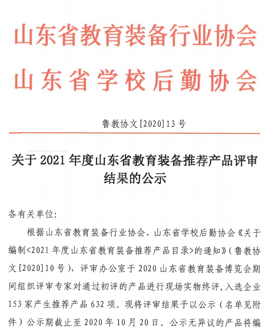 近日,《關(guān)于2021年度山東省教育裝備推薦產(chǎn)品評(píng)審結(jié)果的公示》發(fā)布,共在全國(guó)范圍內(nèi)入選企業(yè)153家產(chǎn)生推薦產(chǎn)品632項(xiàng),確定2021年度推薦產(chǎn)品名單。