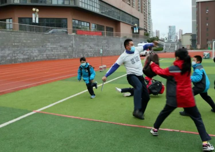 校門口值班領導、老師和導護家長、特警、保安迅速響應,特警、保安持警械與“歹徒”搏斗對峙、堵截。
