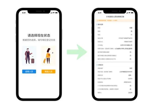 人員返鄉(xiāng)、離鄉(xiāng)前,使用微信掃碼進(jìn)入系統(tǒng)進(jìn)行申報(bào)填寫。