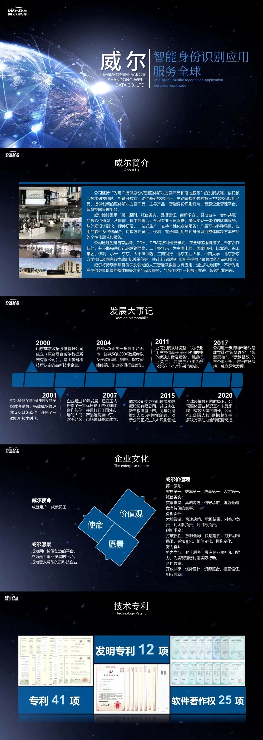 山東威爾數(shù)據(jù)股份有限公司以“為用戶提供身份識別整體解決方案及落地服務(wù)”的發(fā)展戰(zhàn)略,聚焦校園及政企用戶,主導(dǎo)產(chǎn)品有:智慧校園協(xié)同教育云平臺、校園身份識別應(yīng)用解決方案、智慧企業(yè)管理平臺、身份識別智能終端,廣泛應(yīng)用于門禁、考勤、消費、班牌、會議、訪客等需要驗證人員身份的場所管理。