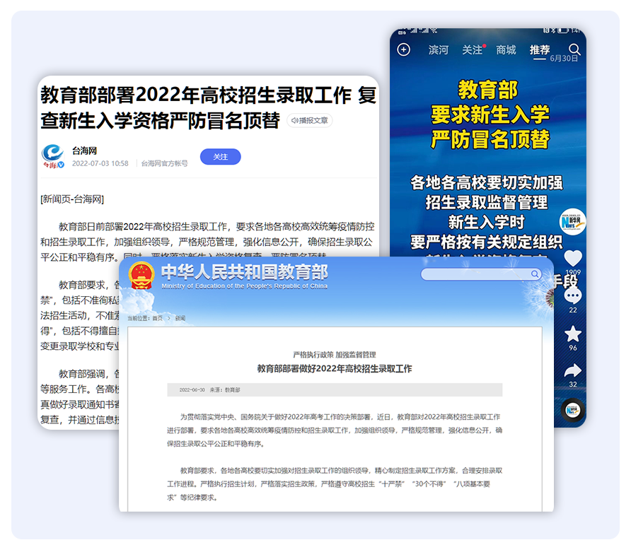 在疫情常態(tài)防控之下,高校很快又將迎來大批新生入學。為貫徹落實黨中央、國務院關于做好2022年高考工作的決策部署,教育部發(fā)文,要求各地各高校切實加強招生錄取監(jiān)督管理,新生入學組織資格復查,嚴防冒名頂替。