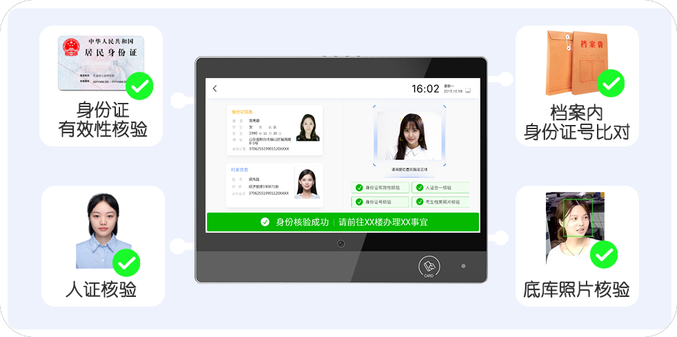 威爾新生報到身份自助核驗解決方案,通過智能終端自助核驗證件信息、本人信息、新生檔案,并進行四重比對確認學生身份,提升校方工作效率,減輕人員投入壓力,有效防范替代上學等情況發(fā)生,助力高校踐行智慧管理。